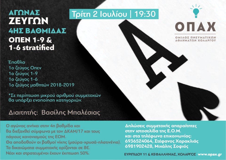 ΑΓΩΝΑΣ ΖΕΥΓΩΝ 4ης ΒΑΘΜΙΔΑΣ ΟΠΕΝ 1-9 & 1-6 taks2019-09-20T14:38:59+03:00 Μοιραστείτε αυτό το άρθρο. FacebookX Related Posts 28o STANDARD TOURNAMENT Gallery 28o STANDARD TOURNAMENT 60th RAPID TOURNAMENT Gallery 60th RAPID TOURNAMENT ΚΡΟΥΑΖΙΕΡΑ BRIDGE ΣΤΗ ΜΕΣΟΓΕΙΟ (ΕΝΗΜΕΡΩΣΗ) Gallery ΚΡΟΥΑΖΙΕΡΑ BRIDGE ΣΤΗ ΜΕΣΟΓΕΙΟ (ΕΝΗΜΕΡΩΣΗ) 59th RAPID TOURNAMENT Gallery 59th RAPID TOURNAMENT