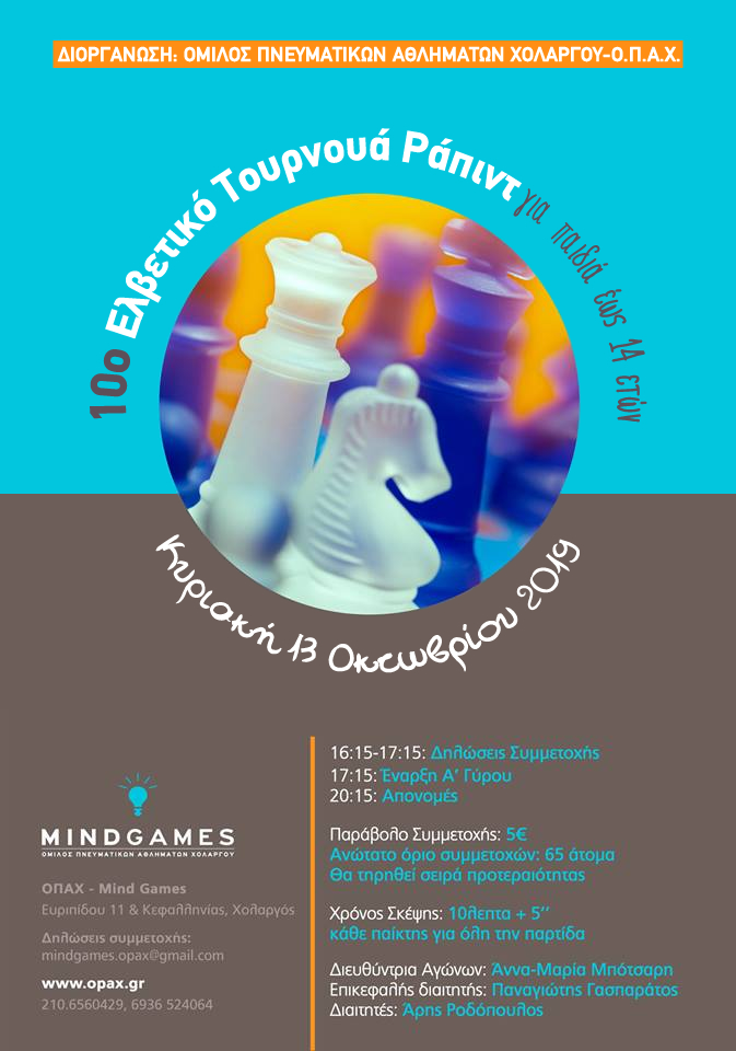 Την Κυριακή 13/10 ξεκινάει το 10ο Σκακιστικό τουρνουά RAPID για παιδιά έως 14 ετών. Ακολουθεί η προκήρυξη του τουρνουά. Σας περιμένουμε!