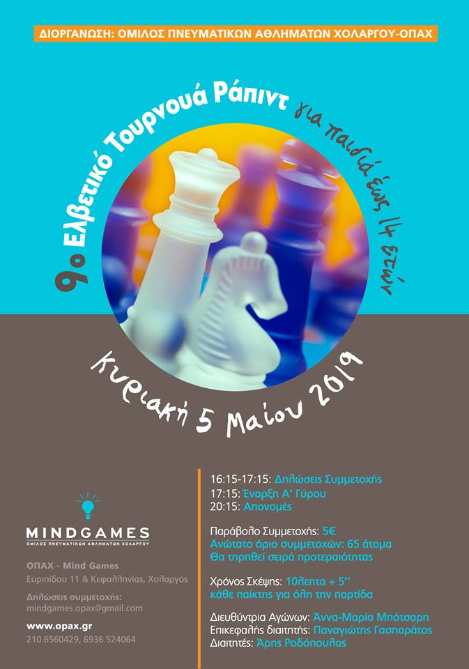 Την Κυριακή 05/05 ξεκινάει το 9ο Σκακιστικό τουρνουά RAPID για παιδιά έως 14 ετών (με διεθνή αξιολόγηση Έλο RAPID). Ακολουθεί η προκήρυξη του τουρνουά. Σας περιμένουμε!