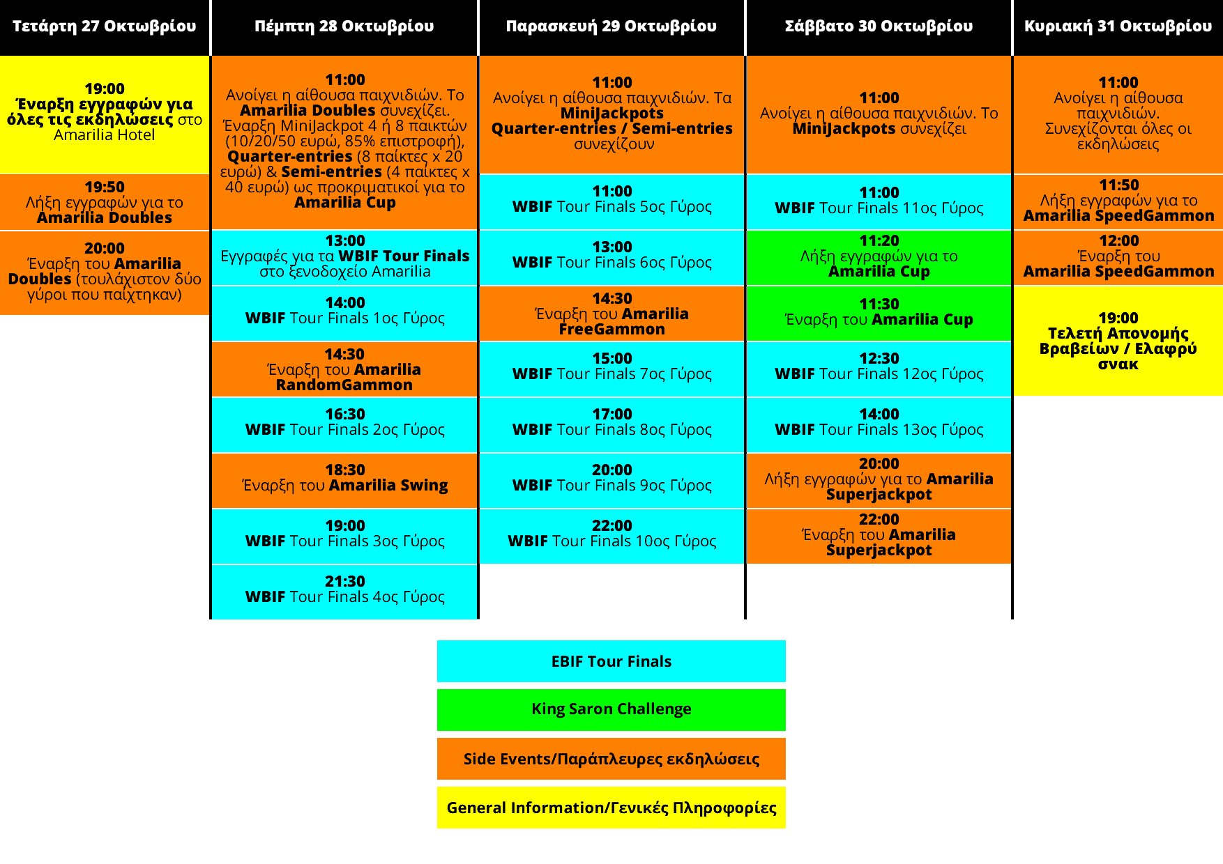 Η δράση ξεκινάει από την Τετάρτη 27 Οκτωβρίου με τους αγώνες του διπλού (Amarilia Doubles), συνεχίζεται την Πέμπτη και την Παρασκευή με κυλιόμενα jackpots, προκριματικούς αγώνες για το main event, αλλά και νέα παιχνίδια που δοκιμάζονται για πρώτη φορά παγκοσμίως σε συνθήκες τουρνουά, για να κορυφωθεί το Σαββατοκύριακο 30 – 31 Οκτωβρίου.