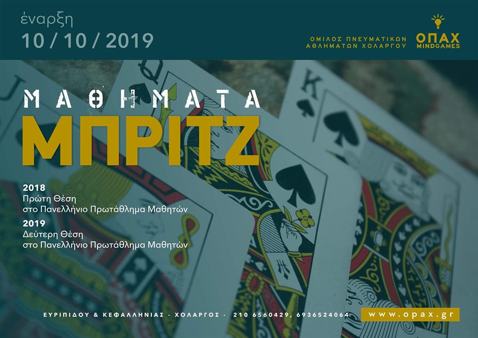 Τα μαθήματα αρχαρίων Bridge του Ο.Π.Α.Χ. ξεκινάνε την Πέμπτη 10/10 στις 17:00 και στις 19:30 το απόγευμα (Δωρεάν μάθημα – συνάντηση γνωριμίας) και γίνονται, όπως και σε όλους τους ομίλους της Ελλάδας, υπό την αιγίδα της Ελληνικής Ομοσπονδίας Μπριτζ.